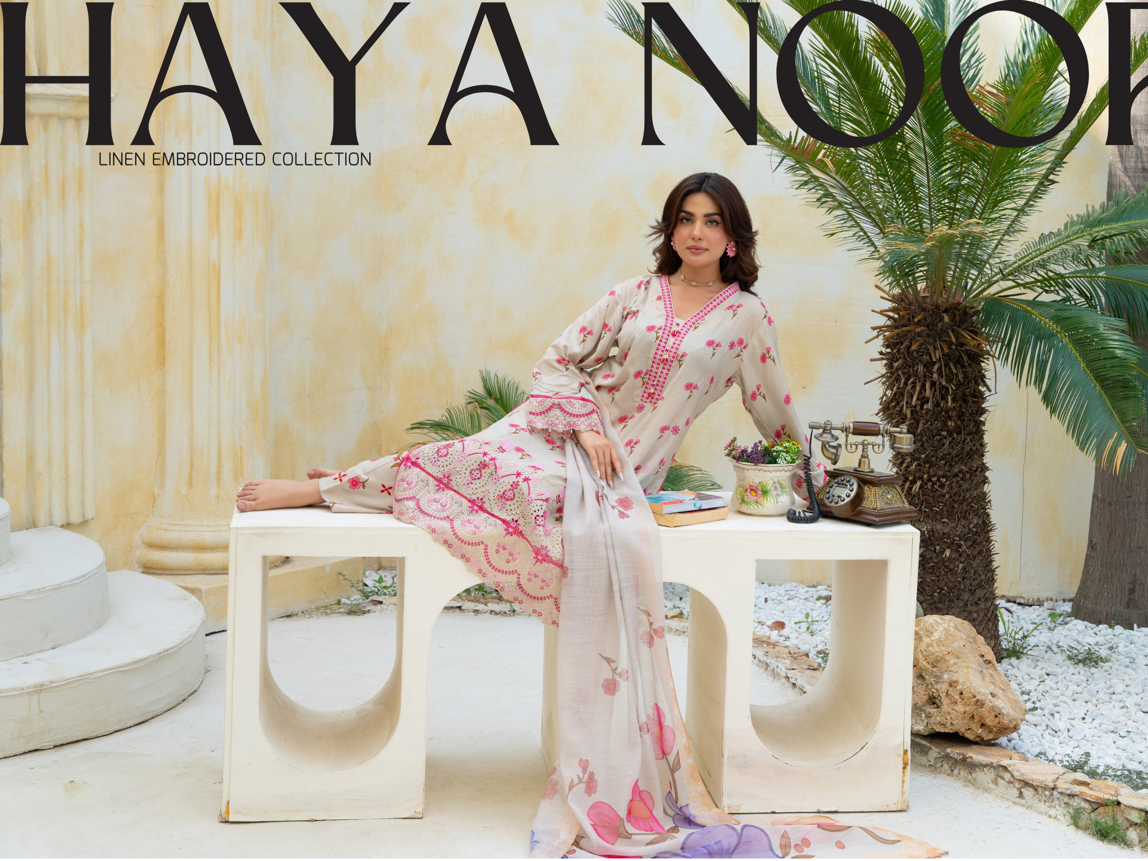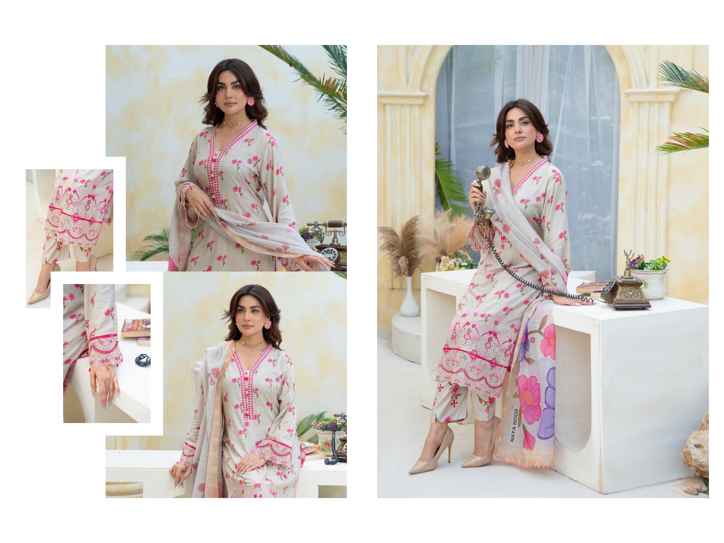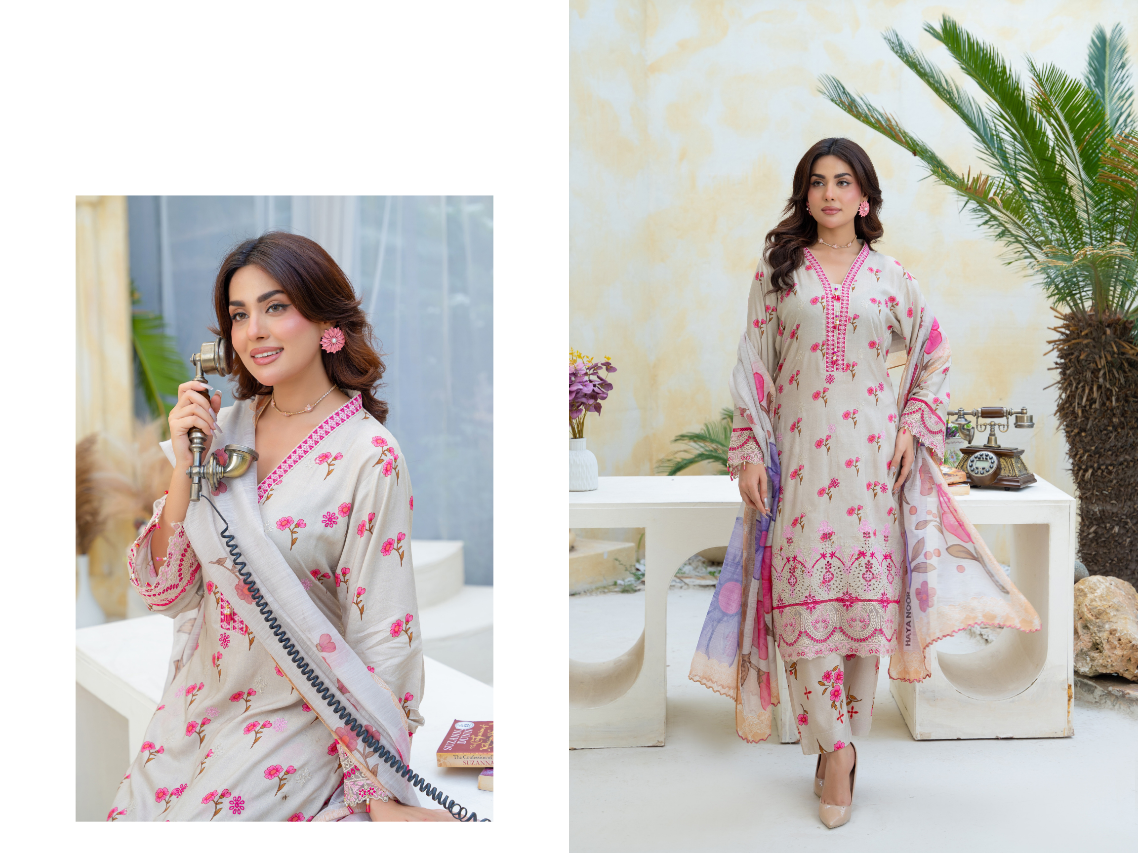 Embroidered 3PC is a radiant winter outfit crafted from premium fabric. The ensemble features a whitte shirt adorned with elegant embroidery on the neckline and sleeves, paired with beautifully printed trousers. A soft, printed shawl with floral patterns completes the look, adding a touch of charm and comfort. Perfect for summer gatherings, this design blends warmth, elegance, and vibrant seasonal hues.