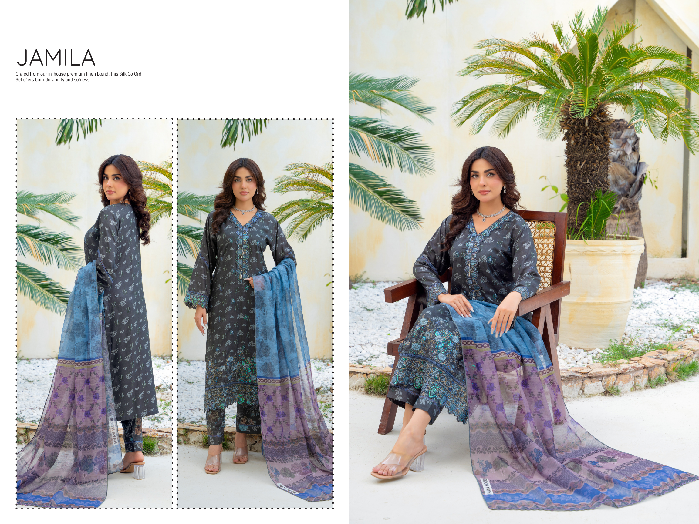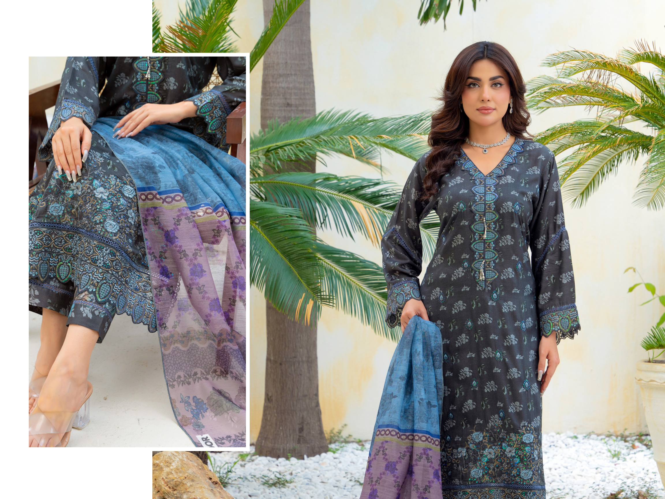 Embroidered 3PC is a radiant winter outfit crafted from premium fabric. The ensemble features a blue shirt adorned with elegant embroidery on the neckline and sleeves, paired with beautifully printed trousers. A soft, printed shawl with floral patterns completes the look, adding a touch of charm and comfort. Perfect for summer gatherings, this design blends warmth, elegance, and vibrant seasonal hues.